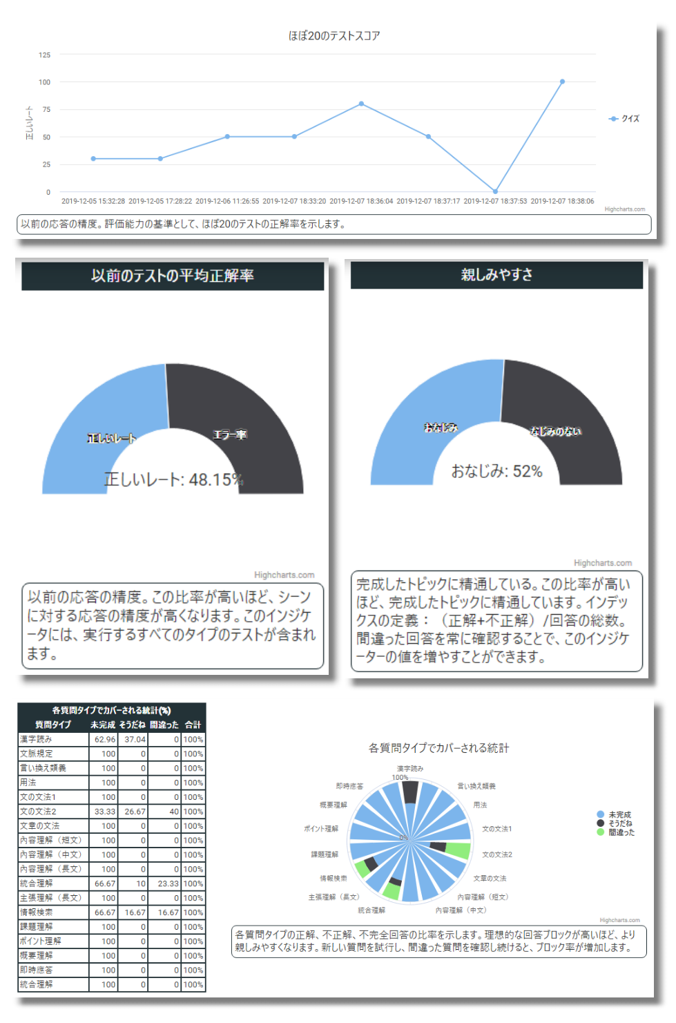 学習の記録- 分かりやすいグラフなどで、勉強の進度や、試験と復習の結果などを表しています。そこから苦手分野を把握して、学習計画をたてることができます。